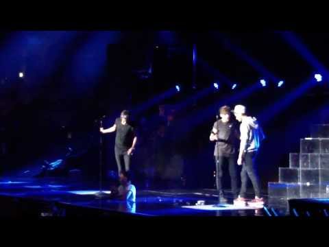 I say as I stand "Right who brought a sign or a poster with them?" I walk over to the other side of the stage and I read out a sign that says "Cute as a button every single one of you. I just saw a sign up there." I then spot another sign and read it aloud "Finally 21. Why are you here then why aren't you in Vegas?" Harry then says "Happy birthday." I then start to make my way over to the other side of the stage asking "How are we doing over this side? Are we good?" I spot another sign and say "Harry we have got a couple of girls over here that are interested in a game of golf with you" I spot another sign and read it aloud "You make me happy as well. I mean I make you happy. You make me happy. Why aren't we together? We should be." We then continue the concert.